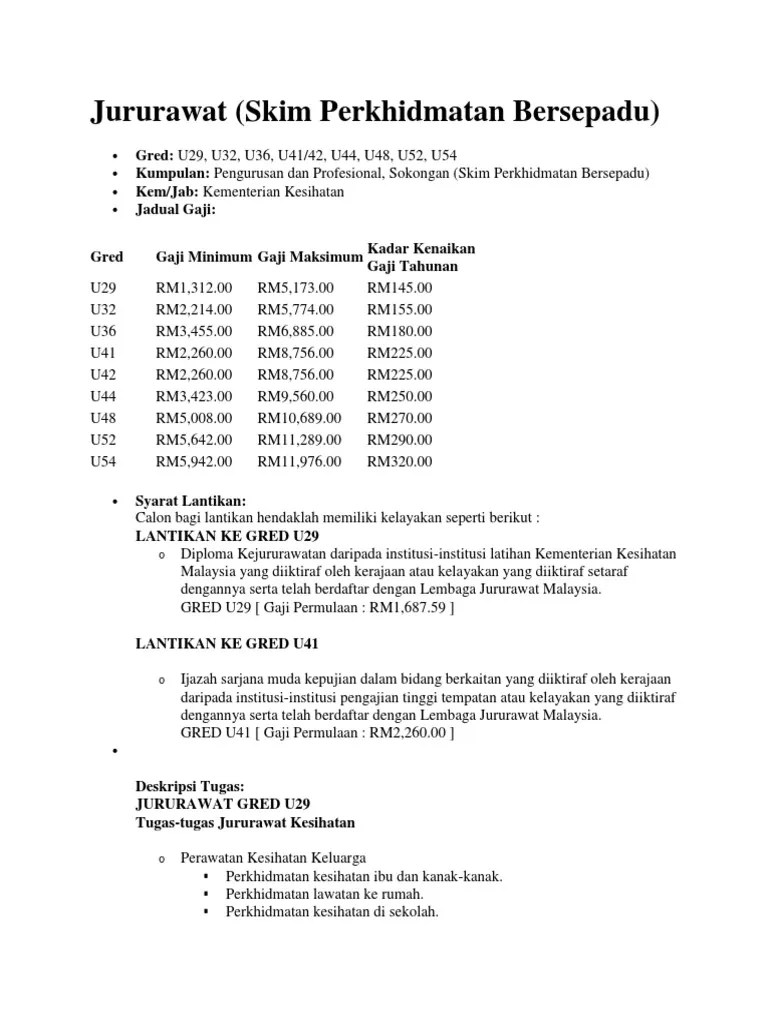 Sekiranya bidang hospitaliti menepati cita rasa anda, cubalah memohon pekerjaan sebagai jururawat (nurse). Dipohon daripada bahagian gaji dan elaun, jabatan perkhidmatan awam (jpa). Jawatan jururawat gred u29 ini merupakan antara . 9) jadual gaji gred u29. Buku kerjaya jururawat di kementerian kesihatan malaysia (kkm) ini. Senarai gaji elaun khas dan kemudahan jururawat spa . U29 rm 1493.44 (p1t6) rm 3057.39 (p1t27) Cara memohon jawatan jururawat u29 di kementerian kesihatan malaysia kkm terbuka. Kelayakan lantikan ke gred u41. Profesor madya dalam bidang kejuruteraan, perundangan, kejururawatan, ukurbahan,.